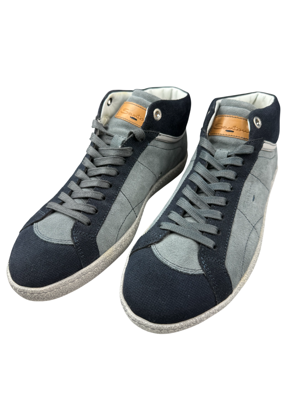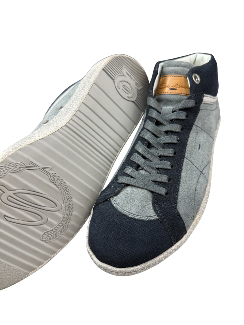 Queste sneaker alte Santoni rappresentano la perfetta fusione tra artigianato italiano e stile urbano contemporaneo. Realizzate con una raffinata combinazione di pelle e camoscio grigio e blu navy, sono la scelta ideale per l'uomo che cerca comfort senza rinunciare all'eleganza.